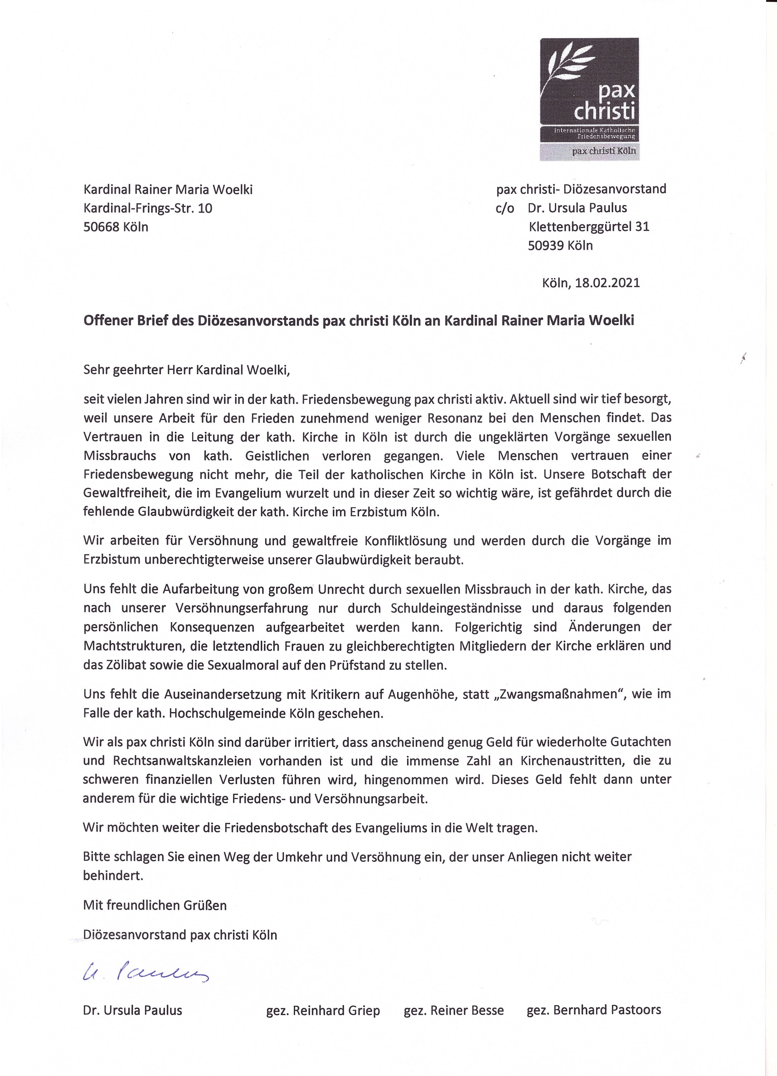 Offener Brief des pax christi Diözesanvorstand an Kardinal Woelki