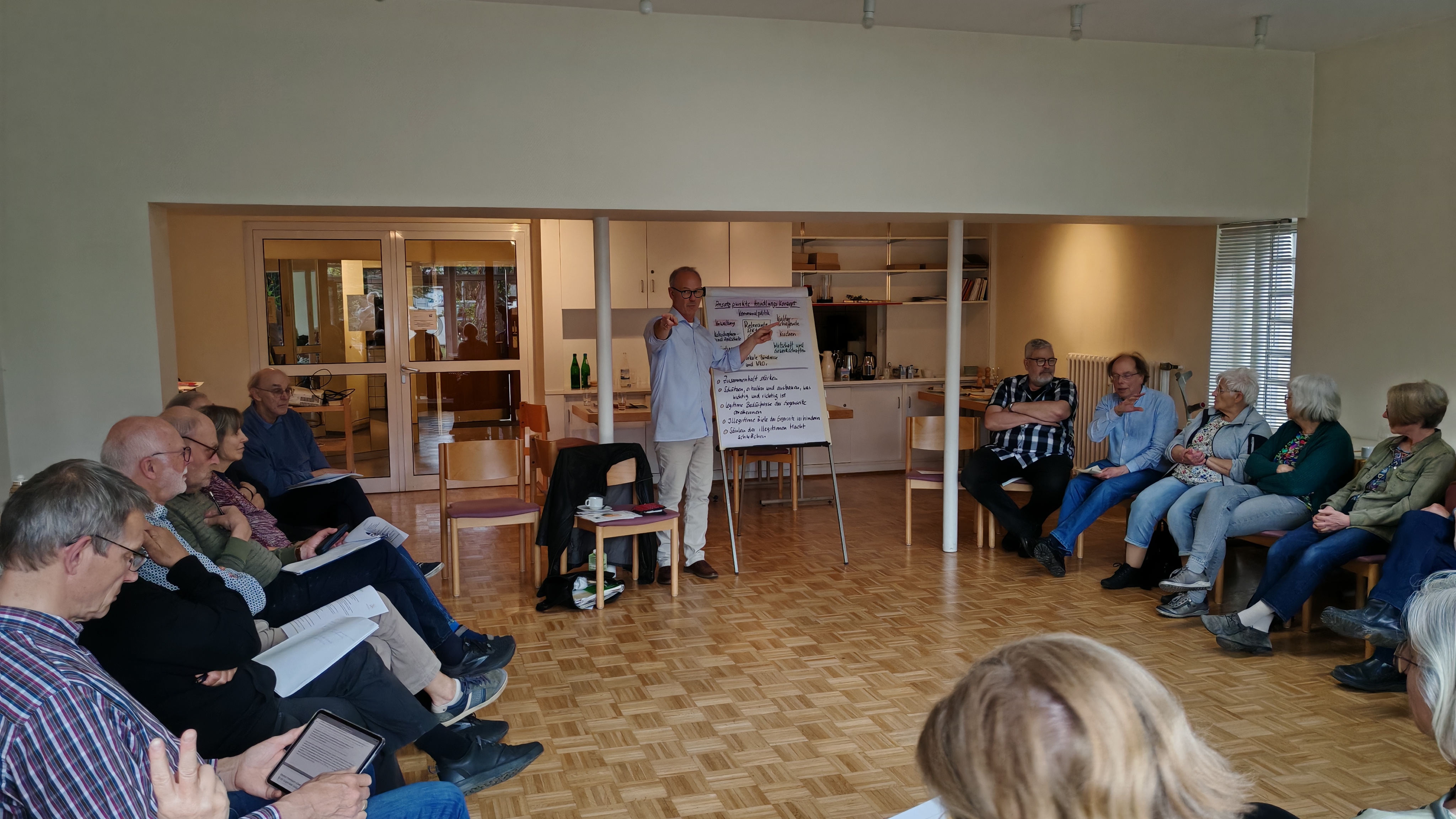 Im öffentlichen Studienteil "Wehrhaft ohne Waffen - wie geht das" brachte uns Joachim Mangold von "gewaltfrei handeln e.V." Theorie und Praxis der sozialen Verteidigung nahe, s. a. Download.
