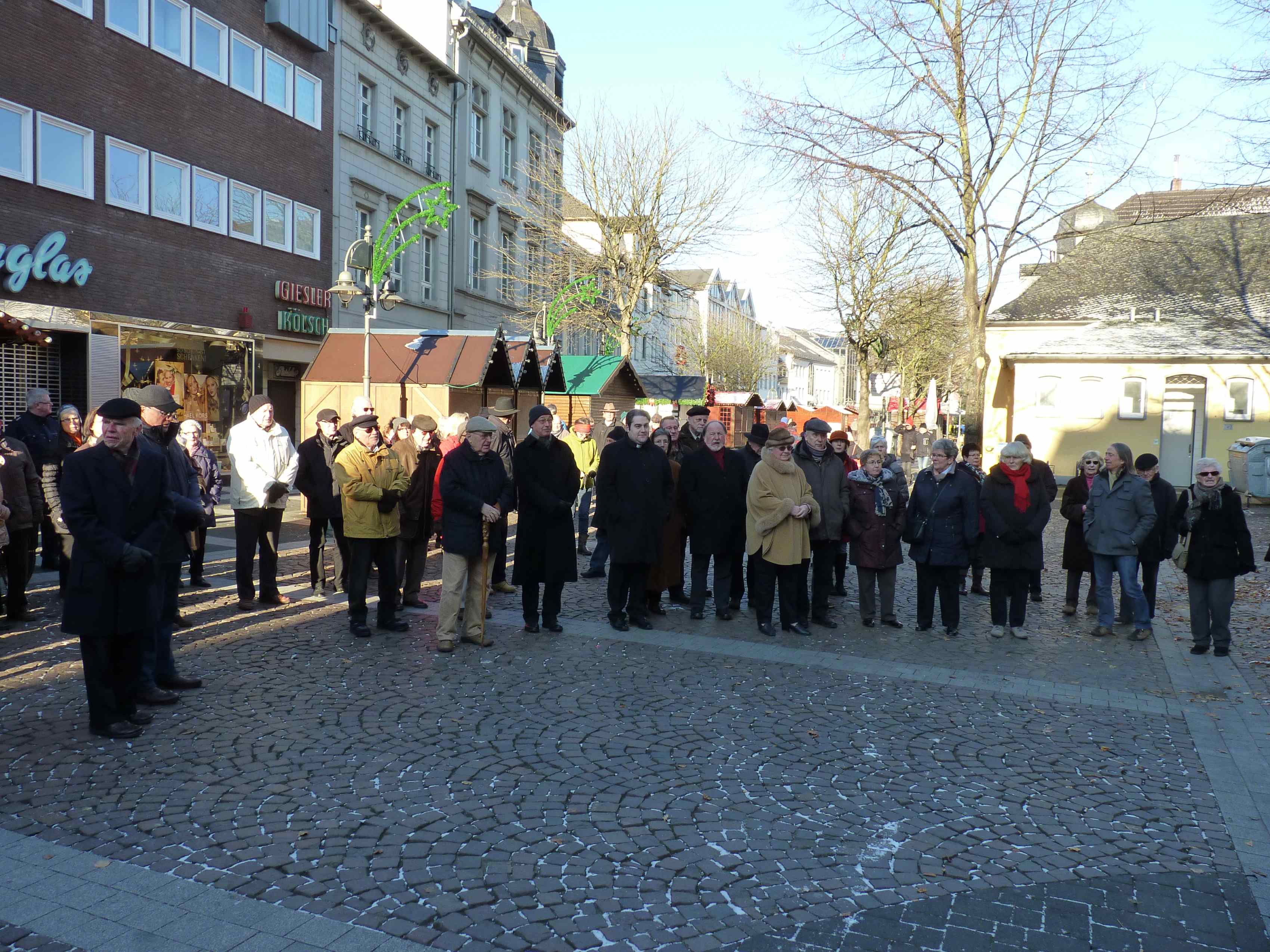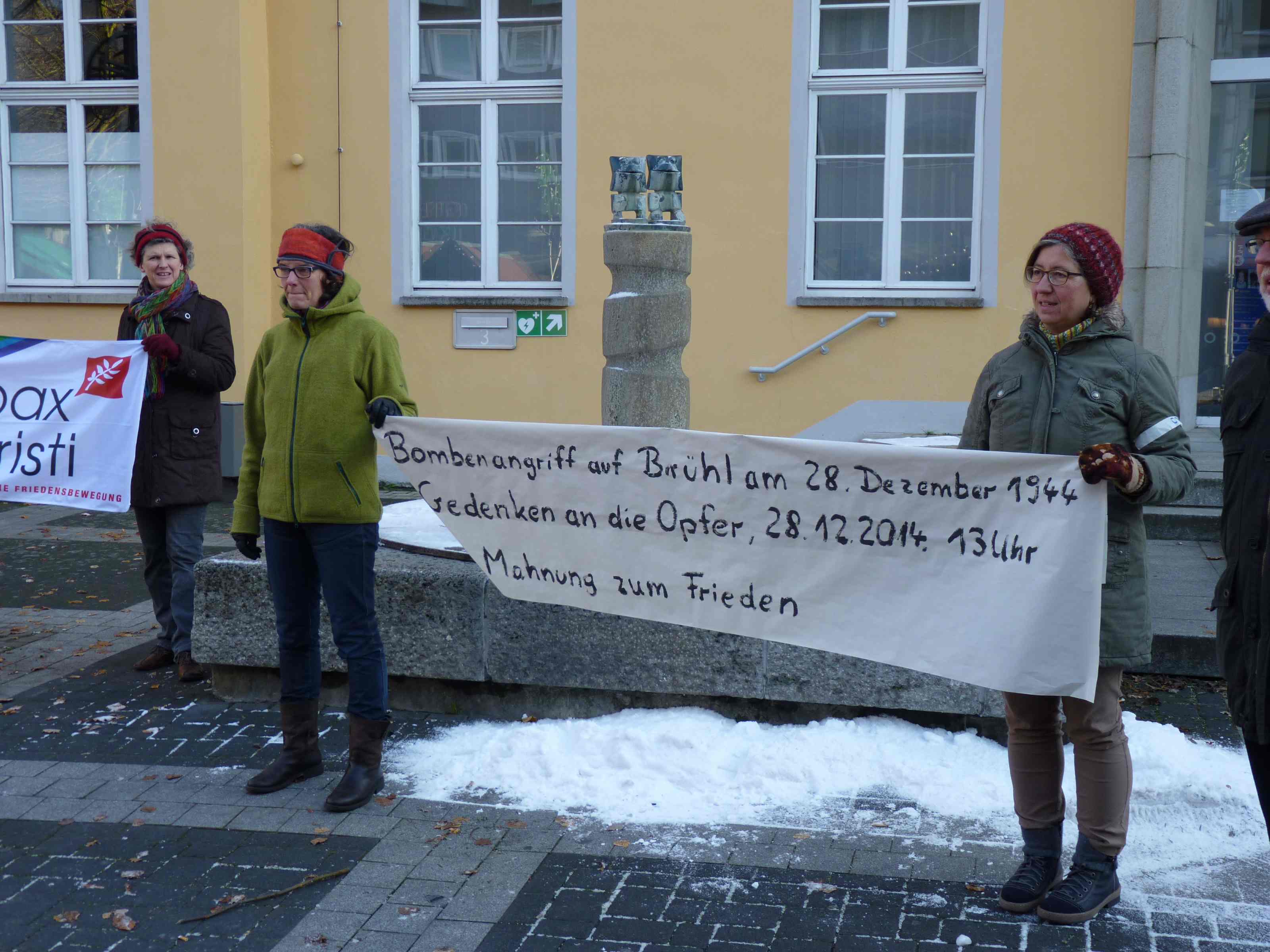 Am 28.Dezember 1944 war Brühl das Ziel eines schrecklichen Bombenangriffs, bei dem (je nach Quelle) bis zu 182 Brühlerinnen und Brühler getötet wurden. Vor dem Rathaus trafen sich um 13:15 Uhr rund 100 Menschen, um des Bombenangriffs zu gedenken."Die Erinnerung an die Opfer von Gewalt und Terror in der Zeit der Hitlerdiktatur und des Zweiten Weltkriegs ist uns Mahnung zum Einsatz für den Frieden in unserem Land und international. Auch heute fordern Terror, Kriege und Bürgerkriege ungezählte Tote und Verletzte. Erheben wir unsere Stimme gegen Krieg und Terror! Stehen wir den Menschen auf der Flucht bei!" Zitat aus dem Aufruf.